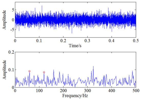 In order to extract the weak modulation frequency 60 Hz, CWT method is used to filter the signal around 1500 Hz first shown in Figure 9. Then envelope spectrum analysis is used for the signal and the result is shown as Figure 10. It can be seen from Figure 10, although the characteristic frequency 60 Hz and its harmonic frequency 120 Hz marked with red circles can be extracted. However, due to the noise interference, the useful feature information is not clear and submerged in strong noise. Therefore, the characteristic frequency needs to be analysed further with feature enhancement algorithm.