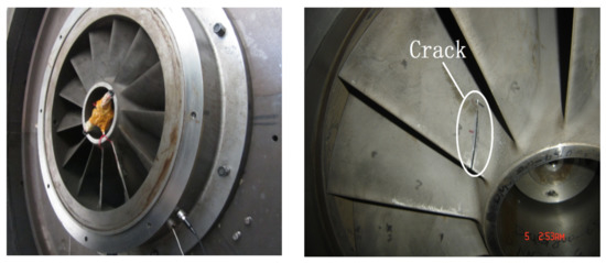 Many scholars studied the blade condition monitoring with different ways. For example, Rao et al., proposed a method to extract the characteristic information from vibration signal of the gas turbine for recognizing the blade state [5]. Witek studied the development process of the blade crack by using a vibration signal obtained in the laboratory [2]. Egusquiza et al. studied the blade failure mechanism of a turbine pump, which provides the theoretical foundation for blade characteristic extraction [6]. In addition, acoustic emission signal is also investigated for the defect classification of turbine blades [7]. Support vector machine has been proved to have good performance on shaft crack classification and prediction, therefore, it was tried to diagnose the blade damage of a helicopter [8]. At the same time, König conducted a series of studies on the rotating impeller failure mechanism through a pressure pulsation signal, which provided good results and confirmed that the vibration information of the blade can be reflected in the pressure pulsation signal [9,10]. However, most of the research is focused on the gas turbine currently, although there exists a certain similarity between centrifugal compressors and gas turbines. Moreover, most of the research hasn’t focused on the blade on-line condition monitoring, especially by using pressure pulsation signal. Considering the interaction between the blade and the airflow nearby during the operation of the compressor, pressure pulsation signal close to the rotating impeller may well reflect the health states of the blade and therefore is selected for the identification of blade crack in this paper.