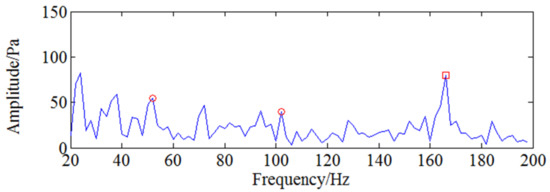 Therefore, the feature frequency caused by blade crack needs to be demodulated with further analysis. As the blade passing frequency is 1083.33 Hz, CWT is first used to filter the signal around 1083 Hz and the filtered signal is reconstructed through continuous wavelet inverse transform shown as Figure 16. Envelope spectrum analysis is then used for the filtered signal and the result is shown in Figure 17. The two frequencies marked with red circles in Figure 17 are 53 Hz and 106 Hz respectively, that is to say, there exists typical frequency multiplication relationship between the fundamental frequency 53 Hz and the harmonic frequency 106 Hz. It can be determined that 53 Hz is the characteristic frequency excited by blade crack which will be verified by strain test shown in the following but it is not clear enough due to strong noise interference. Moreover, it can also be found the two times shaft frequency component 166.6 Hz marked with red rectangle is more obvious compared with 53 Hz. Therefore, WSG stochastic resonance model is absolutely necessary to further process the envelope signal for the purpose of enhancing the weak characteristic frequency 53 Hz.
