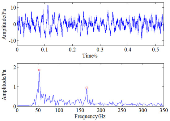 According to the optimization result of GA, the optimal parameters of the WSG stochastic resonance model are set as respectively and the corresponding rescaling factor is set as 1000 to change 53 Hz into small parameter. Calculate the output signal and go ahead with spectrum analysis by Fourier transform. The obtained output signal and the corresponding spectrum are shown by Figure 18 and it can be seen the characteristic frequency 53 Hz marked by red circle is more obvious than two times shaft frequency 166.6 Hz marked by red rectangle. Comparing Figure 17 and Figure 18, it can be clearly found the characteristic frequency is much easier to be identified with the further processing of stochastic resonance. Therefore, it can be known the effective weak crack information enhancement is achieved by the proposed CWT-WSG stochastic resonance method.