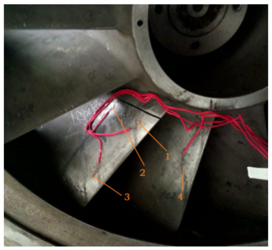 The blade’s strain test acquisition system consists of a SG403/SG404 four-channel wireless strain sensor node, a wireless receiving gateway, BeeDate wireless sensor network software and BF120-2AAGN20-W strain gauges. The installation of the wireless strain node is shown in Figure 19. Strain signal is sampled both from the cracked blade and the adjacent normal blade and the installation positions of strain gauges are shown in Figure 20, wherein position 1,2,3 are attached on the cracked blade and position 4 is on a normal blade.