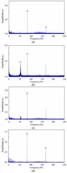 Analysing the strain signal obtained at 5000 rpm working condition. The acquired spectrums are shown in Figure 21 and it can be seen from the result that the blade’s defect frequency of 53 Hz can be detected at position 2 and position 3. This characteristic frequency at measuring point 2 which is near the crack is more obvious but it cannot be found at point 4, which is on the normal blade. Based on the analysis result of the strain signal, it can be found that the low frequency of 53 Hz exists both in the strain signal and the pressure pulsation signal. In order to further ensure the reliability of the identified defect frequency, the strain signal is also sampled and analysed at 4000 rpm and 4500 rpm working conditions. The defect characteristic frequency can still be obviously extracted from the frequency spectrums. Moreover, there will exist a low frequency component modulated to the high frequency component-blade passing frequency in the condition that the impeller blade is cracked according to References [5,25]. Therefore, it can be proved that the proposed method is reliable and effective for the condition monitoring and weak defect identification of the incipient blade crack.