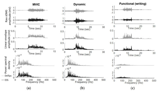 Sample sEMG signal from one subject’s FCU for (a) MVIC; (b) dynamic and (c) functional tests indicate that there were no significant differences between the Delsys (lighter grey) and ESS electrodes (darker grey) based on raw sEMG amplitude, linear envelope amplitude, or power spectral density.