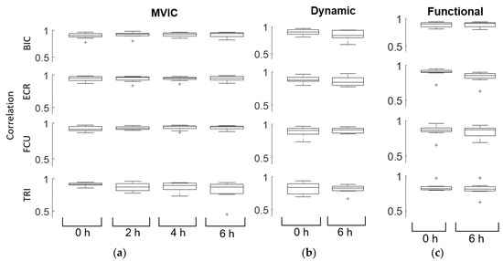 Linear envelope correlations for (a) MVIC, (b) dynamic, and (c) functional tests indicate high similarity between the Delsys and ESS electrodes. The rows illustrate the correlations for BIC, ECR, FCU, and TRI (top to bottom, respectively). Plus signs represent outliers. Correlation did not change significantly with time. The ECR had the highest correlation across time points and tests, followed by FCU, BIC, and TRI. The dynamic and functional tests performed slightly worse for ECR and TRI compared to MVIC (p < 0.05), and the functional tests performed slightly worse for FCU (p < 0.05) compared to MVIC.