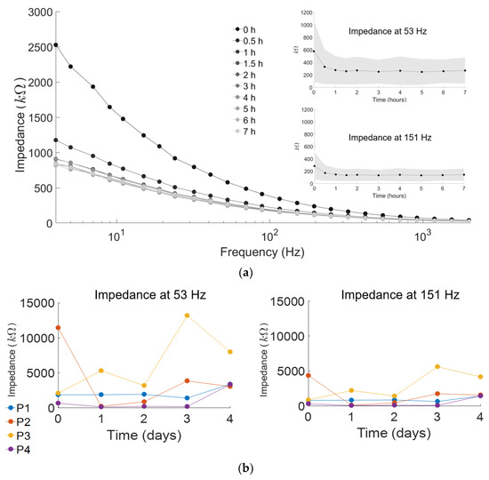 Skin impedance recorded over the seven-hour and four-day trials indicated stable signals over time from the ESS electrodes (Figure 5). Impedance values decreased for the first two hours before stabilizing for the last five hours at an average of 252 kΩ at 53 Hz and 139 kΩ at 151 Hz (Figure 5a, insert). Of the 20 logarithmically equal intervals from 4 Hz–2000 Hz, these two frequencies were chosen to represent the varying stability of skin impedance since they fall within the 50–150 Hz window reported to encompass the majority of sEMG power [28,44].