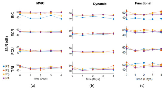 SNR for each muscle group across four days for (a) MVIC; (b) dynamic and (c) functional tests show consistent quality signals for all time points and muscles.