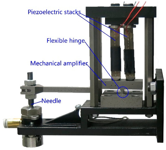 In the 1970s and 1980s, many experts studied ink-jet technology [7,8,9,10], but this technology is only applicable for low viscosity (<10 mPa·s) fluid [11]. The piezoelectric jet dispensing technology for high viscosity fluid was first proposed in 2007 [12]. After that, a great deal of research about jetting valves or droplet-forming theory have been published [13,14,15]. Wang designed a piezoelectric jet dispenser and studied the jet performance [16,17]. Ahamed proposed a non-contact drop-on-demand three-layer micro droplet generator based on electrostatic actuation [18]. Lu proposed a piezoelectric impinging jet valve to investigate the effect of different structural parameters on performance [19]. Many other experts have devoted their energies to jet dispensers and made great achievements [20,21,22,23,24,25]. A bi-piezo stacks-driven jet dispenser was proposed in a previous study [26]. The bi-piezo stacks-driven jet dispenser is shown in Figure 1. The piezoelectric jet dispenser stacks work alternatively. The needle moves back and forth with the lever of the mechanical amplifier. The fluid inflow channel flows with the needle, and pressure forms. The structure and dimension of the flow channel determines the pressure. The pressure makes droplets jet out from the nozzle. The work frequency of the proposed jet dispenser can reach 500 Hz. The dispensers have achieved encouraging results, but the flow channel influence of a novel bi-piezoelectric jet valve on jet performance has not been studied.