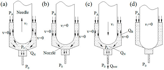 The principle of mechanical collision-based jet dispensing is presented in Figure 3. At the beginning, the needle moves upward, pressure Ps is smaller than PA, and fluid flows into the nozzle. The fluid flow direction of the process is presented in Figure 3a. After reaching the top of the stroke, the needle will stop for several microseconds, so that the fluid can fully fill the nozzle chamber. In this process, vz = 0 and PA = Ps. Then, the needle moves rapidly downward, fluid around the needle flows with the needle, and pressure in the nozzle forms. Fluid in the chamber will be jetted out. In this process, as PA < Ps, part of the fluid in the chamber flows backward. The fluid flowing direction of the process is presented in Figure 3c. The needle stays at the bottom of the stroke for a period of time that is dependent on the work frequency. In this process, the needle matches the nozzle to prevent fluid leaking. After this step, the next cycle follows. The needle reciprocates in the nozzle chamber at high speed. Fluid in the chamber can jet out on demand.