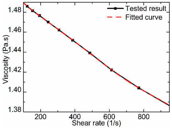 The viscosity of a fluid is one of the key factors affecting the jet performance of mechanical collision-based jet dispensing. Adhesives used in the experiment were tested with a Malvern Kinuex rheometer, at 25 °C. The results were fitted to a fifth-order polynomial. The tested property of the selected adhesives and the fitted results are presented in Figure 4. The fitted polynomial is shown as Equation (1).