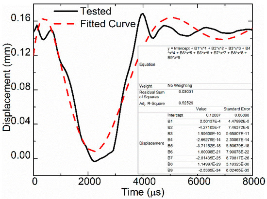 Some experts simplify the needle displacement as a sinusoidal wave in simulation models. This reduces the accuracy of the simulation. With the following parameters of voltage = 120 V, duty circle = 0.3, and frequency = 100 Hz, the needle displacement was tested by a laser displacement sensor, and the results were fitted to a ninth-order polynomial. The tested displacement and the fitted curve are presented in Figure 5. The ninth-order polynomial cannot depict the tested results accurately. Therefore, the needle displacement was obtained through an interpolation algorithm in the simulation model.