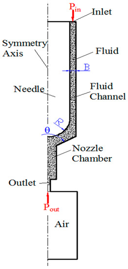 The moving meshes were analyzed with the self-programed UDF (user defined function) where the needle was a moving part. The displacement of the meshes was defined as the interpolation of the tested results. The fluid property was also defined as the fitted polynomial (Equation (1)) using UDF. The filling pressure (Pin) at the inlet was 0.4 MPa, and the pressure at outlet (Pout) was the atmospheric pressure (0.1 MPa). The needle radius was R = 0.75 mm, and the end of the needle was a hemisphere. The fluid around the needle flowed with the needle, and the flow velocity was equal to the needle-moving velocity. Velocity of the fluid near the nozzle wall was zero. In the simulation model, the temperature variations were ignored.