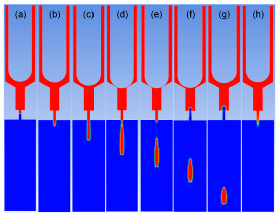 Volume fraction contour: (a) the beginning of a jetting process; (b) the needle starts moving downward; (c) fluid is just jet out from the nozzle; (d) the filament breaks off; (e,g) the droplet moves downward; (f) the needle starts moving upward; (h) the end of the cycle.