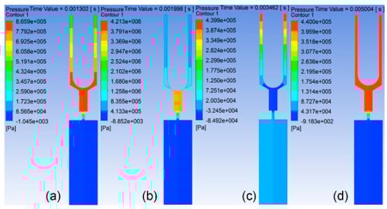 To study the impact of flow channel on jet performance, the simulation and experiment were carried out. The volume fraction contour figures during the work processes are presented in Figure 7, and the pressure contour figures during the work processes are presented in Figure 8. According to the operating principle of the jetting dispenser, the working process consists of three stages.