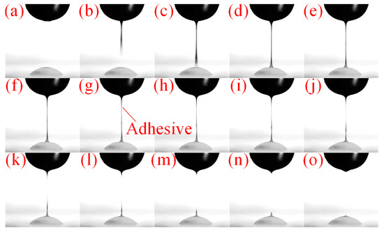 Droplet formation process: (a) the beginning of the cycle; (b) the fluid is jet out from the nozzle; (c) the fluid jet from the nozzle strikes the substrate; (d–h) the neck of the filament appears; (i–k) the radius of the filament becomes extremely small and the filament breaks off; (l–n) the bottom droplet forms a droplet and the top filament recoils back to the nozzle due to negative pressure in the nozzle chamber and surface tension; (o) the end of the cycle.