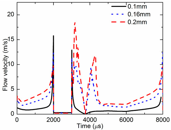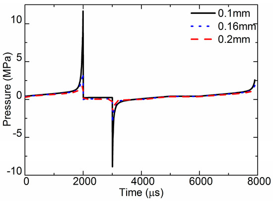 For a different requirement, the diameter of the nozzle outlet may be different. The simulated results of pressure curves are presented in Figure 10. It is obvious that the pressure-varying trends of the three different size nozzles were similar during the jet process, but the amplitude of the pressure was different. When the diameter was 0.1 mm, the max pressure was 11.8 MPa, and the max negative pressure was −8.98 MPa. When the diameter was 0.16 mm, the max pressure was 3.58 MPa. When the diameter was 0.2 mm, the max pressure was 1.92 MPa. The smaller the diameter of the nozzle outlet, the higher the pressure was, because fluid leaking from the small outlet was difficult when the needle moved.