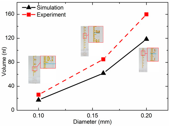 Droplet volume is a key parameter of jet performance, which must meet the requirements of different industries. The simulation results were evaluated by an image-processing method. The droplet image is shown in Figure 7. Assuming that the droplet was axisymmetric, the droplet can be observed as a number of cylinder stacks. The volume of the droplet can be calculated as the volume summary of a number of one pixel high cylinders, approximately. In the experiment, the volume of ten thousand droplets was tested with a graduated cylinder. Then, the average volume of the droplet could be calculated. Figure 12 presents the relationship between the droplet volume and the size of nozzle outlet. When the cone angle was 120°, the channel width was 0.1 mm, and when the diameters of the nozzle outlet were 0.1 mm, 0.16 mm, and 0.2 mm, the volume of the droplet was approximately 19 nL, 62 nL, and 119 nL, respectively. The droplet volume increased with the diameter of the nozzle outlet.