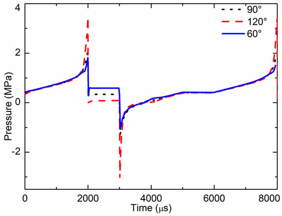 The cone angle of the nozzle is marked as θ in Figure 6. As the cone angle might affect the jet performance of the micro jet valve, it is an important parameter in jet valve design. The impacts of cone angles on jet pressure, flow velocity, and droplet volume were studied. The simulated results of pressure at the nozzle outlet of one cycle are shown in Figure 13. When the cone angle was 120°, the max pressure at the nozzle outlet was 3.2 MPa, and the max negative pressure was −3.2 MPa. When the cone angle was 90°, the max pressure at the nozzle outlet was 2 MPa, and the max negative pressure was −1.8 MPa. When the cone angle was 60°, the max pressure at the nozzle outlet was 1.82 MPa, and the max negative pressure was −1.07 MPa. The pressure of the 120° cone angle nozzle was greater than that of the 60° and 90° cone angles.