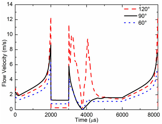 The simulated results of flow velocity at the nozzle outlet during one cycle are shown in Figure 14. The max flow velocity of the 120° cone angle nozzle was 12.5 m/s, the max flow velocity of the 90° cone angle nozzle was 8.5 m/s, and the max flow velocity of the 60° cone angle nozzle was 6.36 m/s. The flow velocity of the 120° cone angle nozzle was larger than that of the 60° and 90° cone angles.