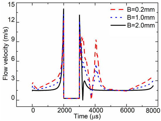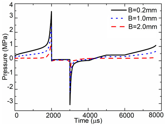 The flow channel is the gap between the needle and the nozzle. The width of the channel is marked as B in Figure 6. The impacts of the channel width were also studied, and the simulated pressure curves at the nozzle outlet of different channel widths are presented in Figure 15. When B = 2.0 mm, the max pressure in the jet stage was approximately 1.5 MPa. When B = 1.0 mm, the max pressure in the jet stage was approximately 2.48 MPa. When B = 0.2 mm, the max pressure in the jet stage was approximately 3.5 MPa. When the gap is larger, there will be more fluid flowing back in the channel during the jet stage.