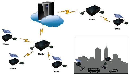The third category would be hybrid WASNs, which arise as a good trade-off between cost and required features of scalability, reliability and flexibility [5]. This typology of acoustic networks include both high capacity nodes, which are able to perform signal processing algorithms in real-time against the recorded data, and low capacity nodes, whose main goal is to compute the value. This architecture is cheaper than the one only composed of high-capacity sensors, because the high capacity nodes are only deployed where needed, and it is scalable to wide zones at a lower cost. This hybrid architecturealso makes it possible to sense remote zones with no access to power supply by means of the use of a low-capacity sensor fed by solar panels. In [11], the authors present the design of an acoustic sensor network based on this approach. The hardware platform for a basic node is a low power C whose main goal is to compute the and transmit the collected data periodically. The advanced nodes allow far more processing capabilities in comparison with the basic ones, since they use a small PC with a 2 GHz Intel Atom Processor running a Linux operating system. The advanced nodes can both store and process the acoustic data, which are designed to be flexible for the necessary signal processing analyses. Also in [37], the authors obtain the measurements of the RUMEUR project from sound level meters installed in a sensor network that pursues the understanding the measured signal, assess actions to mitigate noise and communicate the information about the soundscape in Ile-de-France. The RUMEUR hybrid networks [18] includes both high accuracy equipment for critical places, like airports, where the focus is to obtain detailed acoustic information due to the intense noise environment, together with less precise measuring equipment in other locations aimed at only updating of the noise map with the corresponding level. Achieving a good trade-off between cost and accuracy is also the core idea of the WASN design in the DYNAMAP project [19,38]. This project is aimed at the deployment of a low-cost WASN in two pilot areas in Italy, located in Rome [39] and Milan [40], so as to evaluate the noise impact of road infrastructures in suburban and urban areas, respectively. The sensors designed for the DYNAMAP project are low-cost and use class 2 MEM microphones. This hybrid WASN will deploy two types of sensors: (i) high capacity ARM-based sensors, allowing signal processing techniques to analyze and process the acoustic signals in each node [38], and (ii) low capacity Controller (C)-based sensors, with less computational capabilities and fed by solar panels, but more flexible in terms of sensor positioning, maximizing the coverage of the network.