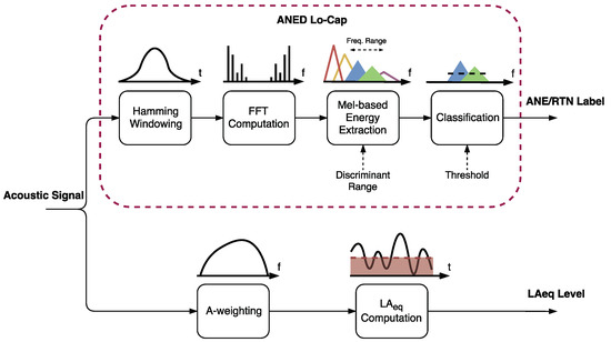 In Figure 2, the block diagram of the acoustic signal processing within the Lo-Cap acoustic sensor is depicted. It includes both the ANED Lo-Cap and the computation of the . The upper part of the Figure, corresponding to the ANED Lo-Cap, details that the algorithm starts windowing the acoustic signal registered in the sensor before conducting the Fast Fourier Transform (FFT) [41] on each input acoustic frame. After that, specific Mel frequency subbands [21] of a pre-studied frequency range outputs are computed as a simple frequency-based scalar product between the squared FFT module and the MFS filter. Next, the spectral energy should be computed from the discriminant range in frequency is compared to a pre-calculated threshold (obtained by means of an optimization process), leading to the classification of each input frame as RTN or ANE accordingly. In parallel, the is obtained through an A-weighted filter applied to the input acoustic signal and subsequently computing the equivalent energy level in dB.