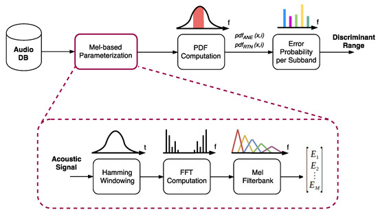 The block diagram of the optimization process is shown in Figure 3. The first stage comprises the MFS parameterization of the entire acoustic dataset, which comprises the windowing of the acoustic signal using a Hamming window [44] of length , the FFT computation of each acoustic frame and the calculation of the output energies () of a M-Mel-based filter bank using a simple scalar product in the frequency domain. Next, two Probability Density Functions (PDFs) of the logarithmic signal level x (in dB) at each i frequency subband are computed, taking into consideration all the signal frames of the dataset that belong to each acoustic class: one for the ANE class, , and another for the RTN class, . These two PDFs are the basis to obtain the one-band threshold-based linear discriminators for classification purposes, through which an error probability function can be derived in terms of each of the M frequency subbands, . This leads us to obtain the most suitable frequency range to discriminate, and thus, classify an input acoustic frame as ANE or RTN.