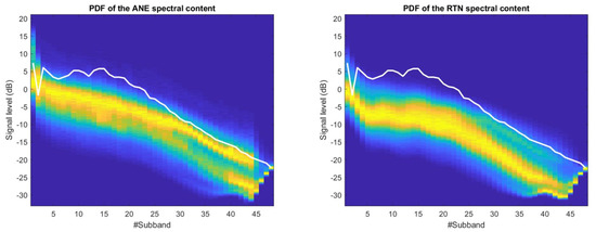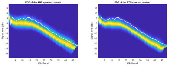In Figure 4, the 2D-PDF matrices corresponding to the MFS distributions of ANE and RTN in the suburban scenario are depicted. For illustrative purposes, all the 2D-PDF visualizations have been scaled at each frequency subband dividing each PDF by its maximum value in order to obtain a more comprehensible plot, so the absolute value of probability is normalized. Also, the optimum decision threshold (see Equation (3)) is plot as a solid white line in both axes across the frequency index.