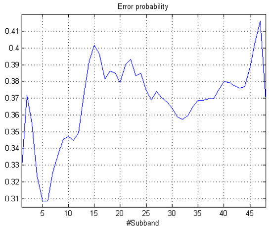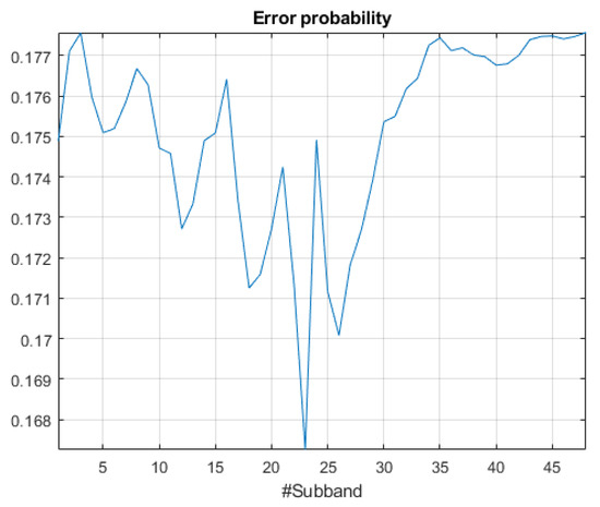 In Figure 4, we can observe a high overlap between the two PDF functions that lead to a hardly stable threshold function, showing a smooth behaviour across the frequency subbands. Figure 6 shows the plot of the final error probability function defined in Equation (2) for the suburban dataset. The absolute minimum error probability is achieved in band 23, being 0.1673. The error probability exhibits also a frequency region with a second local minimum value of 0.17, around subband 26, and another third local minimum around subband 18. This leads us to conclude that in the suburban environment, the most suitable frequency region to take into account in terms of separability can be found within the mid-frequency range.