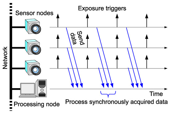 Figure 2a shows a shutter synchronization error among multiple vision sensor nodes. Asynchronous free-running cameras will cause such an error. For precise stereo processing, the shutter triggers should be synchronized as shown in Figure 1. Another possible approach is to use stroboscope illumination [16], which enables acquisition of synchronized images while the cameras are running asynchronously. This scheme enables frame synchronization; however, correct selection of images for stereo processing in a remote node is not guaranteed in networks with random delays, as shown in Figure 2b. To avoid this kind of misselection, each frame has to be timestamped at each vision sensor node prior to being sent. The remote processing node can choose correct frame combinations based on the timestamps. This scenario requires clock synchronization among the vision sensor nodes with negligible errors significantly smaller than the frame interval. The motivation for this work is to provide a scheme that can realize this scenario. For this purpose, we propose to trigger each camera based on the local clock inside the vision sensor node and to synchronize the clocks across the network.