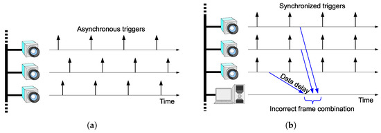 This paper addresses frame synchronization among multiple networked high-speed cameras, as depicted in Figure 1. The motivation of this work is to bring scalability to HSV sensors by connecting the vision sensor nodes via Ethernet. Network latency can cause shutter synchronization errors and incorrect frame combination, as shown in Figure 2a,b respectively. We will present a scheme to avoid these problems.