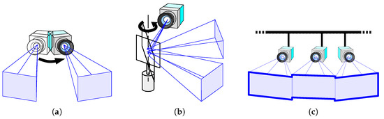 Approaches for expanding the field-of-view: (a) Mechanically turning the camera itself, (b) changing the gaze direction using a galvanometer mirror, and (c) networking multiple cameras.