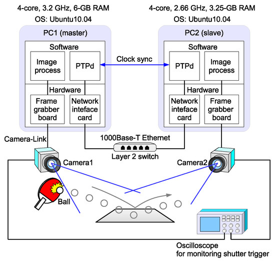 This section presents the experimental system configuration and measurement results obtained with this system. The details presented here have been reported in part in our conference paper [15]. The experimental system, illustrated in Figure 5, comprises two vision nodes: a master and a slave. Each node consists of a high-frame-rate camera (EoSens MC1362) and a controller PC. The slave PC’s clock is synchronized to the master PC’s with a negligible error of a few microseconds. The PTP daemon (PTPd) for Linux OS [17] is executed as a background process and is independent of the image capturing/processing software.