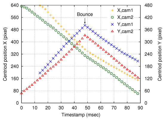 Time-series plot of calculated centroid positions X and Y, which represent the positions of the moving ball in the 640 × 512-pixel images acquired by cameras 1 and 2 at 500 fps. The timestamp at the first ball detection by camera 2 was used as the time origin, . The timestamp error between the two nodes for each frame was less than 10 μs. A ball bounce was observed at ms in both master and slave images.