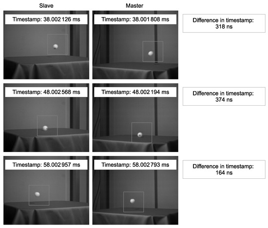 Some of the images acquired by the two vision sensor nodes. The left-hand images were acquired by the slave node, and the right-hand images were acquired by the master node. The images and the corresponding timestamps provided by the PCs are shown. The gray box in each frame represents the region of interest.
