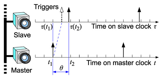 Master’s and slave’s clocks and shutter skew. Because the master trigger timing and the slave trigger are respectively measured based on the master and the slave clocks, the actual time difference, , in the system is unknown.