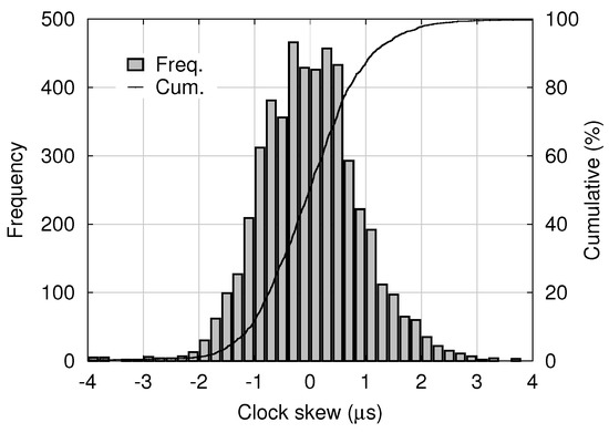where t represents the time measured on the master clock, and denotes the time measured on the slave clock at the master time t. The skew s is estimated and dumped as “offset from master” by the PTPd process running on the slave node. A histogram of estimated skew samples contained in 5000 consecutive log entries dumped by PTPd in the experimental system is shown in Figure 9. The mean and standard deviation were 0.015 μs and 0.98 μs, respectively.