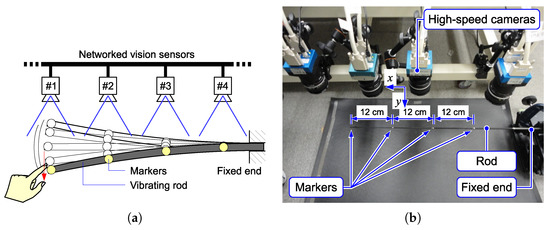 The first experimental setup is shown in Figure 12. One end of a thin rod (a glass fiber tube) was fixed on a fixture to keep a horizontal attitude, and the other end was free. The tip of the thin rod was flicked by a finger, and its vibration was observed. Four markers were put on the rod, and each marker was captured with an HSV sensor. The HSV sensor detected the marker position based on the procedure described in Section 4.