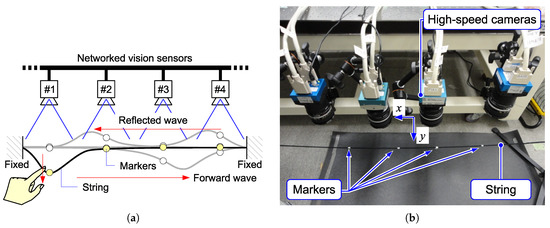 (a) Experiment with a vibrating string. (b) Experimental setup.