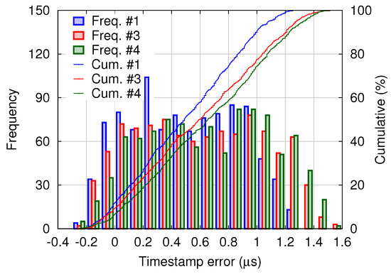 Histogram of the timestamp error between the master (#2) and each slave (#1, #3 and #4).
