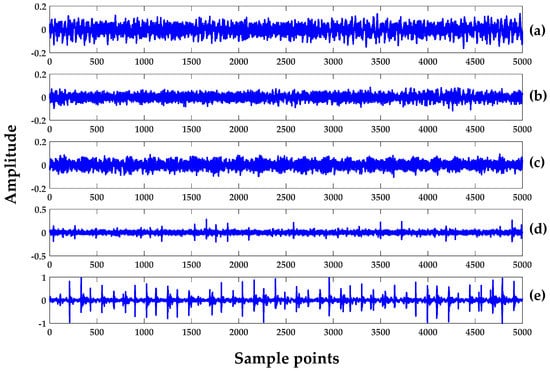 The time series for all of the datasets (see Table 2) in Case 1 are shown in Figure 3. The total length of the data is 600,000 points and they were further divided into several datasets for the convenience of computation. Each dataset consists of 5000, 2048, and 1024 points in Cases 1, 2, and 3, respectively, as described in Table 1. While eight data segments were used in Case 1, only five segments were used for Cases 2 and 3. Both H1 and H2 were the same types of healthy signals (or the baseline). The only difference was that H1 was the standard baseline signal for all signals acquired in the CWRU dataset at zero motor load (i.e., filename: Normal_0). The H2 was a particular case for a healthy signal and became a baseline for outer-race damage recorded in different instances.