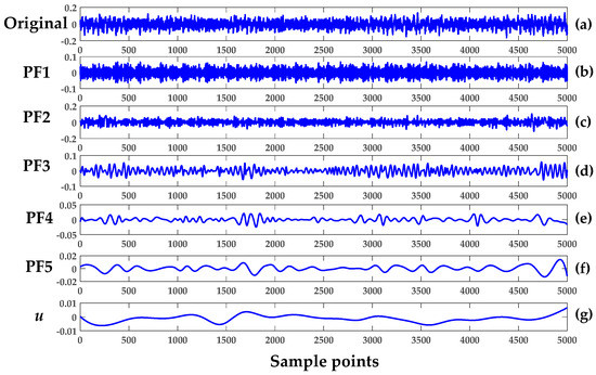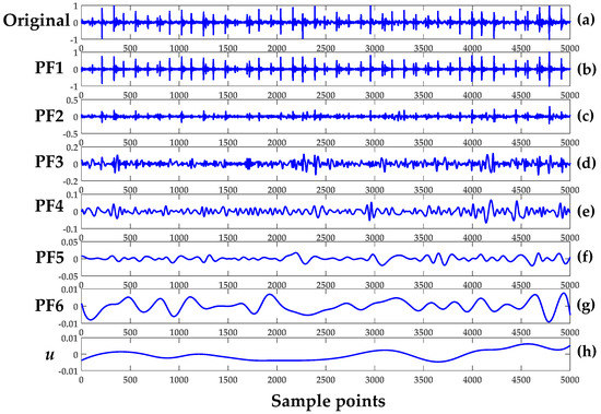 Product functions of the damage Case 1 set: (a) original (D3) vibrational signal; (b) PF1; (c) PF2; (d) PF3; (e) PF4; (f) PF5; (g) PF6; and (h) u is the residual signal.