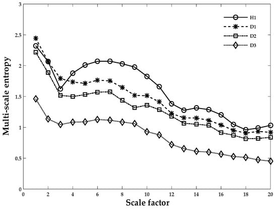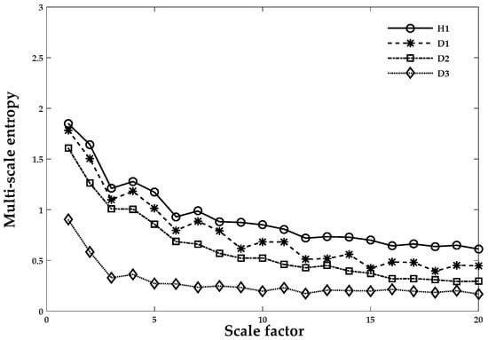 - The PE values were calculated for each coarse-grained signal using Equation (5). The sample entropy values were calculated for the MSE graph.