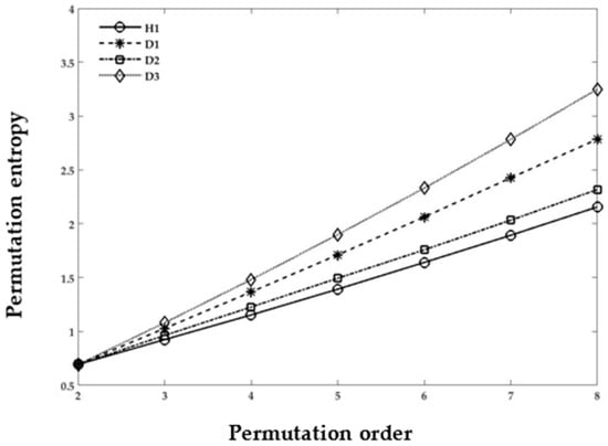 PE was originally proposed to examine the complexity of the natural time series data [33]. PE offers several advantages, such as less computational complexity and stability in the results, over other entropy calculation techniques. The calculation of PE values depends on the τ delay factor and m dimensions. In Figure 8 and Figure 9, the embedded dimension m varies from 2 to 8 in obtaining the optimal value of the permutation order. All the healthy condition sets of Cases 1–3 have variations in the PE value. The theory also states that the smallest value of the embedded dimension m produces inconsistent results. However, for the higher value of m, the PE yields remarkably independent metrics that can be used to distinguish the healthy and damaged REB datasets, as depicted in Figure 8 and Figure 9. The figures also show the implementation of PE in the decomposed REB vibrational signals. All the REB conditions manifest recognizable separation from each other in the healthy and damaged cases (i.e., inner, outer race, and rolling element), as shown in Figure 8 and Figure 9. Note that the “H1” and “Healthy” of both graphs have approximately equal values. The case of “Outer race” in Figure 9 might be compared with D3 in Figure 8. Moreover, it has been shown that the values are approximately equal in the graphs. The results show that, when we have either different data sizes or different damage types, the PE values can distinguish the differences among REB conditions (i.e., healthy, inner-race, outer-race, and rolling element) by changing the value of m in the permutation order.