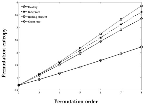 The MPE algorithm was implemented in the REB data, and the preprocessing for the decomposition of the signal remained the same as in the LMD method. The length of data samples N, delay factor τ, and embedding dimension m are effective parameters in the calculation of MPE. If m is a small value, then few characteristics will emerge that will produce a few dynamic changes, and the changes that happen in the time series cannot be determined precisely. On the other hand, if the value of m increases, then the segment space of the time series will be standardized, which requires significant computing time and can be interpreted inaccurately. Therefore, the selection range of m is 4–7 in general [13,27]. We chose m = 4 and the delay factor τ = 1 to calculate PE in a later context. In the next stage, the integrated approach of LMD and MPE was used to detect the features of damaged REB. Again, the MPE measured the complexity of the signal at a different scale factor and different severity of bearing damage. The whole process included the following steps for both the MSE and MPE methods: