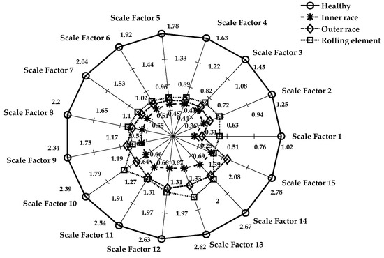 The spider plot is a graphical representation of multivariate data projected onto a two-dimensional graph of more than three quantifiable variables. These variables represent multiple axes, which all start from a single central point. Here, the spider plot is used to demonstrate the comparison of healthy condition cases of REB (i.e., healthy, inner race, outer race, and rolling element) at different scale factors. It also explains the differences among the values of each healthy condition at separate axes of the scale factor. The value of the scale factor starts from the center point (origin) and ends at the outer circle ring. In Figure 10, the healthy case has a maximum value, which shows the outer circle of the spider plot. All the faulty conditions (inner-race, outer-race, and rolling element) are shown toward the center of the circle. In a few instances, the outer race sample entropy value is higher than the rolling element sample entropy value (i.e., at scale factors 9, 11 and 15). In Figure 11, defects on the rolling element and inner-race have the same entropy value only at scale factor 15, which shows the robustness of MPE. Note that the MSE and MPE results have the same damage size and product function, and the entropy values represented are the averages of five segment sets. The same damage severity of different damage locations shows that the bearing defects are more easily separable in the MPE than MSE toward the same original REB signals, as shown in Figure 11.