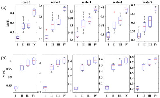 Boxplot for the MSE and MPE of the first five scale factors: (a) MSE (multi-scale entropy); and (b) MPE, where I is a healthy signal, II is inner race, III is outer race, and IV is rolling element.