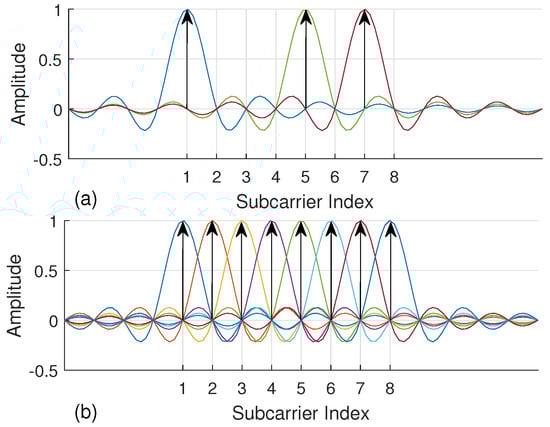 Recently, the proliferation of index modulation (IM) has introduced new research perspectives for 5G wireless systems []. At first, IM has been presented as spatial modulation technique (SM) for multiple-input multiple-output (MIMO) systems to convey information by antenna indices []. The notion of IM is also extended to OFDM and named as OFDM with index modulation (OFDM-IM), which carries information not only by data symbols but also by the indices of active subcarriers [,]. In contrast to conventional OFDM, not all subcarriers are utilized in OFDM-IM. In Figure 1, a simple example is illustrated for an OFDM-IM subblock consisting of eight subcarriers, where three of them are activated to convey data symbols. Extra bits are carried by the indices of active subcarriers to compensate inefficient use of spectrum. In addition, fractional subcarrier activation brings in diversity order as well as less energy consumption []. Hence, OFDM-IM provides a flexible and adaptive structure which can be optimized by considering the demands of next-generation communication systems.