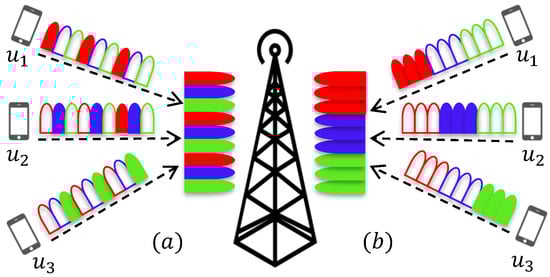 Wireless communication systems can be classified into two fundamental categories, namely human-user-based and machine-user-based from the perspective of 5G use cases and applications [,]. Current technology gives priority to human-based communications. However, the emerging idea of Massive Machine-Type Communications (mMTC) such as Internet of Things (IoT), vehicle-to-vehicle (V2V), vehicle-to-infrastructure (V2I), control of autonomous vehicles and smart cities with millions of sensors poses various demands for the next-generation networks [,,]. mMTC, where a large number of machine users sporadically communicate with a given base station (BS), leads to asynchronous uplink transmission associated with multi-user interference (MUI). Hence, handling of asynchronous impairments is expected to be one of the most challenging problems for mMTC networks [,,].