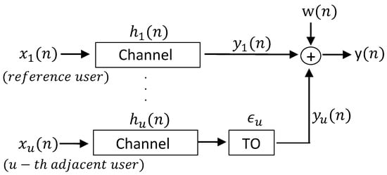 In this paper, it is considered that subcarriers belong to u-th user are orthogonal to each other while machine users’ subcarriers are interfering with each other due to the time offset between them. For this reason, interference coming from other users to u-th user is mainly determined by its adjacent users’ edge subcarriers. Since the subcarriers are sinc functions in frequency domain, inner subcarriers’ sidelobes have less impact on the ICI compared to the edge subcarriers, as explained in [,,]. Therefore, more users can be considered, but the interference coming from users that are not adjacent with the u-th user becomes much smaller.