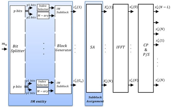 In multi-user transmission, each user has a total of available subblocks to carry bit stream, with . When all the subcarriers are assigned to one user, equals to G. Block diagram for asynchronous OFDM-IM transmitter is shown in Figure 4. Each OFDM-IM subblock consists of bit stream, which is divided into and bits. The indices of active subcarriers are defined from bit stream, while remaining bit stream is mapped to conventional M-ary symbols , which are carried by the activated subcarriers. Division of the p bit stream is illustrated by “IM” entity in Figure 4. The indices of active subcarriers of u-th user for l-th subblock are defined as